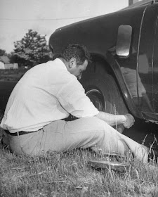 Don't change a tired without gloves, the tire could have ran over sap and could cause Poison Ivy. Photo by Al Fenn. LIFE. 1949.